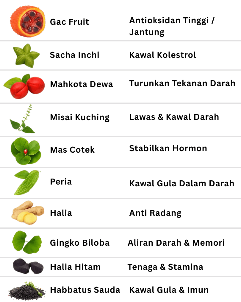 Diformulasi khas dengan 10 ekstrak herba semula jadi membantu Melancarkan Peredaran Darah, Mengawal Paras Gula & Kolestrol, Serta Menguatkan Saraf dan Tenaga Dalaman